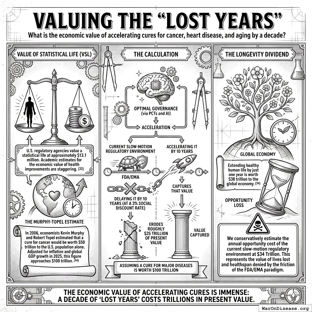 If the Waste Ledger is a tragedy of burning capital, the Opportunity Ledger is a tragedy of unrealized exponentials. This ledger attempts to price the “dog that didn’t bark,” the cures, technologies, and economic explosions that would exist if governance prioritized velocity and scientific leverage over stasis.