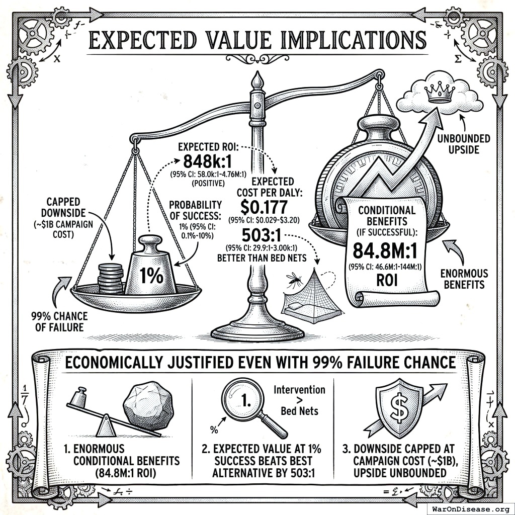 At 1% (95% CI: 0.1%-10%) probability of success, expected ROI is 848 thousand (95% CI: 58 thousand-4.76 million):1 (still positive, even assuming near-certain failure) and expected cost per DALY is $0.177 (95% CI: $0.029-$3.2), which is 503x (95% CI: 30x-3.0kx) better than bed nets at $89 (95% CI: $78-$100)/DALY.