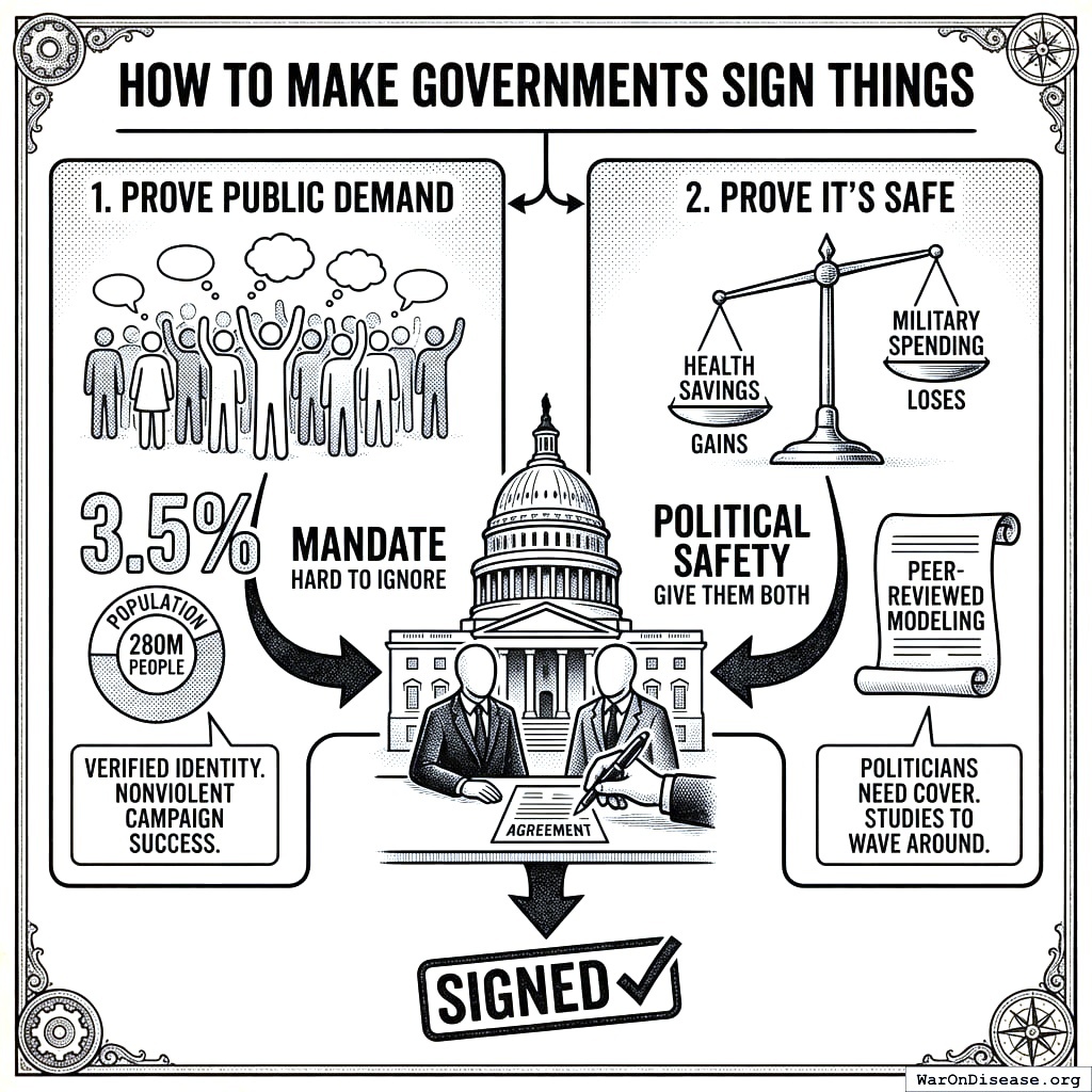 First, prove public demand. Get 3.5% (95% CI: 1%-10%) of the population63 (280 million people) to say “yes” with verified identity. The 3.5% (95% CI: 1%-10%) finding63 is not a magic law of treaty ratification. It is a coordination heuristic: the point where a cause stops looking like a niche moral hobby and starts looking like a voting bloc large enough to create career risk. That’s not activism. That’s a mandate.