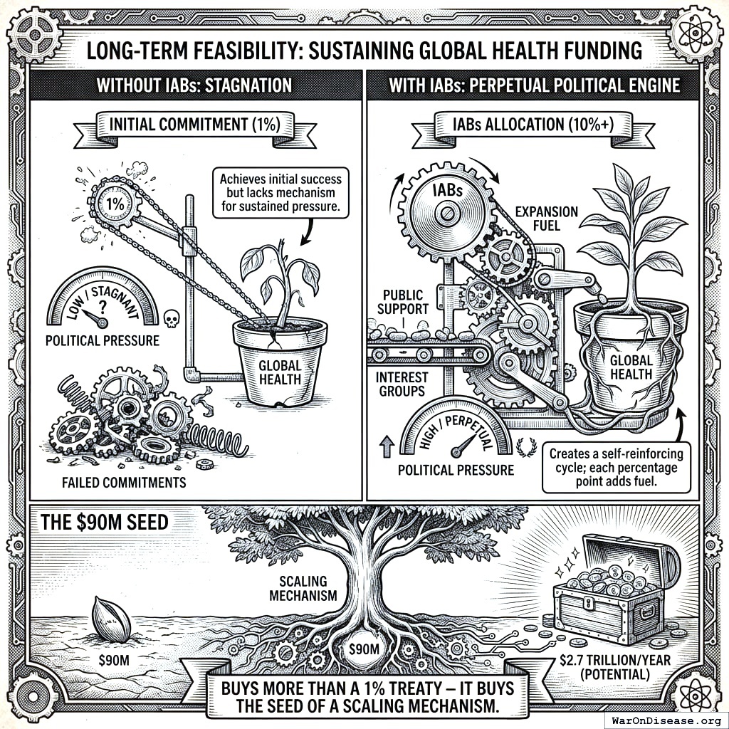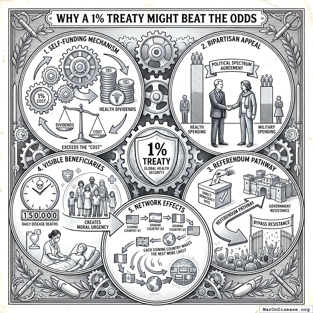 It’s self-funding: the health dividends exceed the “cost,” so you make money by doing the right thing, which is the only way your species does the right thing. “Should we cure more diseases?” polls well across every political spectrum, alongside “Is water wet?” and “Should we pay Congress less?” It has a referendum pathway that bypasses government resistance (politicians hate this, which is how you know it works). It has visible beneficiaries: 150 thousand deaths/day. And each signing country makes the next more likely, because peer pressure is humanity’s most reliable technology and the reason your teenagers wear the same shoes.
