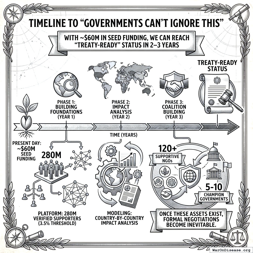 With the first phase of a $1 billion campaign, you can reach “Treaty-Ready” status in 2-3 years: a platform with 280 million verified supporters (the 3.5% (95% CI: 1%-10%) threshold), country-by-country impact modeling, and a coalition of 120+ supportive NGOs and 5-10 champion governments.