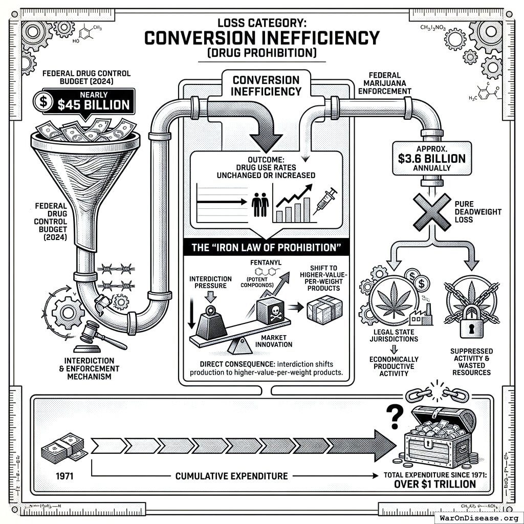 Methodological Note: Subsystem losses are estimated independently and treated as additive. While some overlap may exist (e.g., housing costs affect health via stress, incarceration overlaps with drug enforcement), excluded categories (state/local inefficiency, implicit subsidies, behavioral effects) likely offset any potential overstatement.