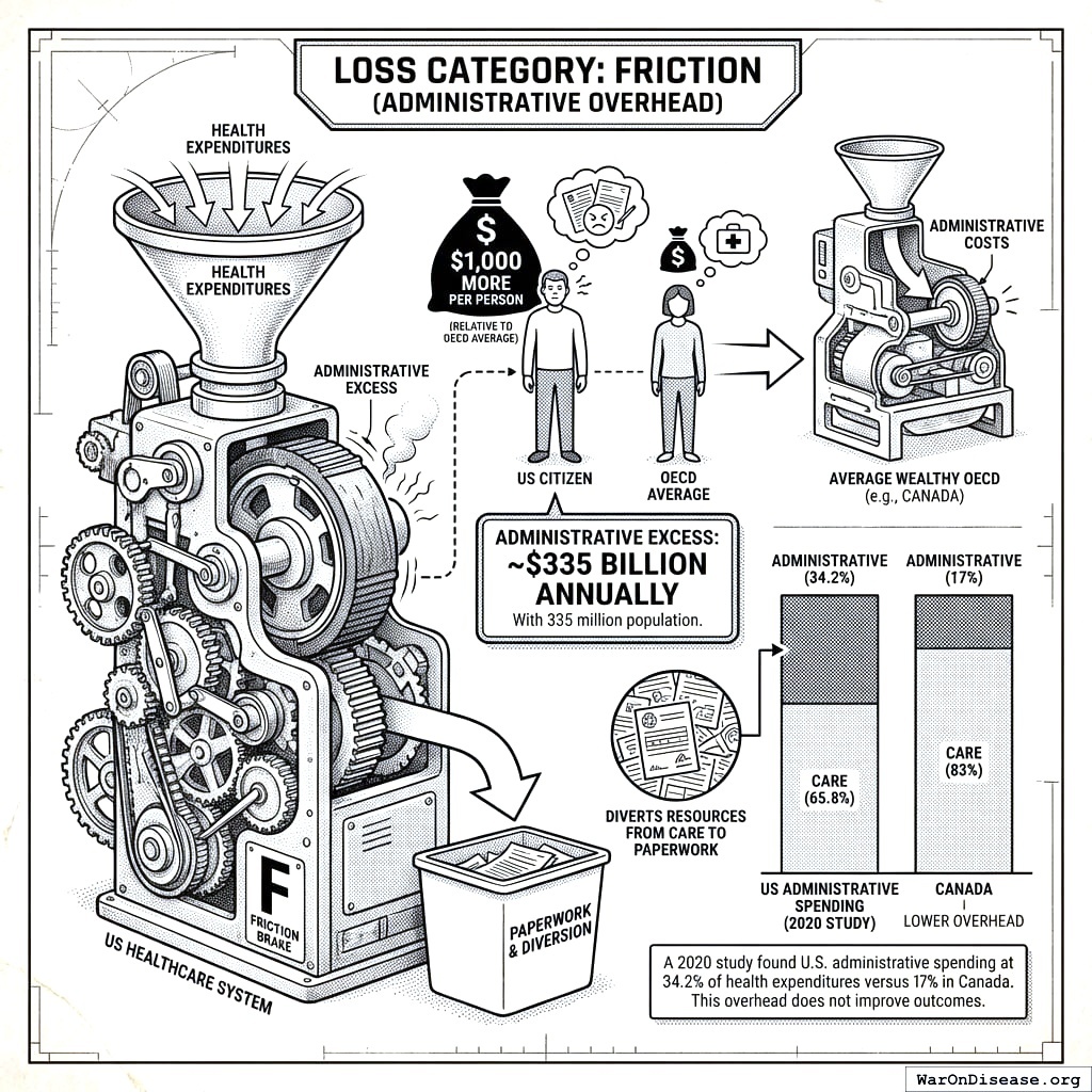 a OECD benchmark derived from comparative per-capita spending analysis: peer nations (Germany, France, UK, Canada, Australia) achieve comparable outcomes with lower discretionary waste rates108.