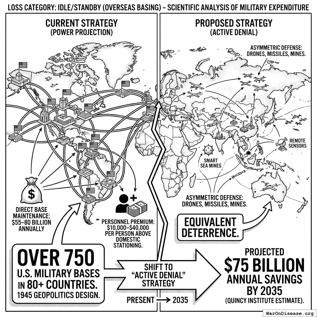 Think of military spending: the $615 billion (95% CI: $500 billion-$750 billion) “overspend” above strict deterrence baseline represents federal dollars that could fund disease eradication treaties instead of maintaining 750 overseas bases150.