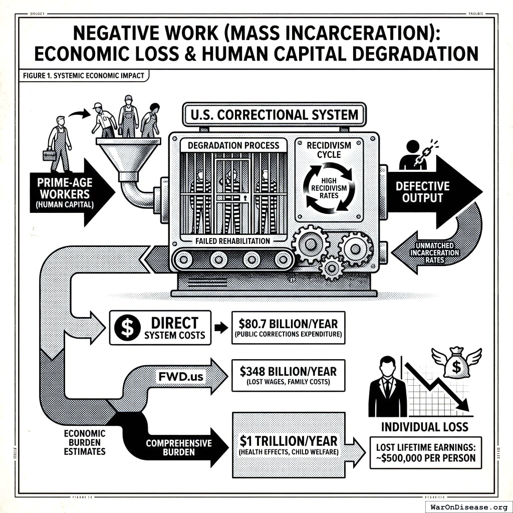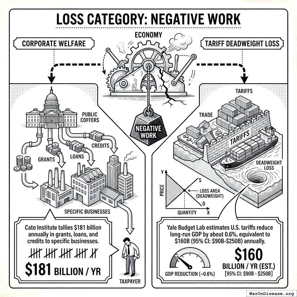 Actual budget allocations flowing to low-value uses. This is traditional “government waste”: military overspend, corporate welfare, drug war enforcement, fossil fuel subsidies, agricultural subsidies. The solution is budget reallocation-redirect these dollars to higher-return uses without increasing total spending.