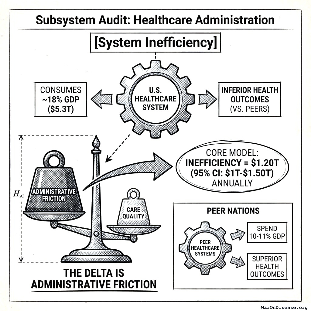 Fundamental design failures where the system architecture itself prevents efficiency. Healthcare exemplifies this: $1.2 trillion (95% CI: $1 trillion-$1.5 trillion) in administrative waste not from bad management but from fragmented payment systems, lack of price transparency, and perverse incentives built into third-party payment structures.