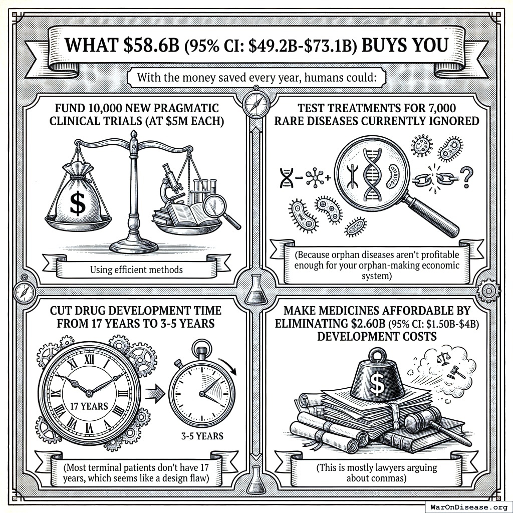 Your current system charges $41,000 (95% CI: $20,000-$120,000) per patient in a clinical trial. I asked why and was told “regulatory compliance, site management, and monitoring overhead,” which I believe is the human phrase for “permission costs more than medicine.” Pragmatic trials, the kind your decentralized FDA runs, cost $929 (95% CI: $97-$3,000). At that price, $21.7 billion (95% CI: $21.7 billion-$21.7 billion) buys you 23.4 million patients/year (95% CI: 9.44 million patients/year-96.8 million patients/year) trial slots per year.