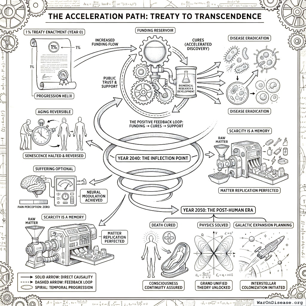 10.5281/zenodo.18161560 6.65 thousand diseases have zero FDA-approved treatments; at current trial capacity, exploring them takes 443 years. Redirecting 1% of military spending scales capacity 12.3x, cutting the timeline to 36 years and preventing 10.7 billion deaths. At $0.00177/DALY, 50.3kx more cost-effective than the best existing interventions. Incentive Alignment Bonds make adoption politically viable.