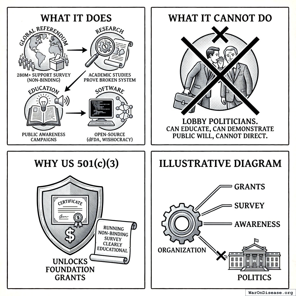 What kind of organization fits: A purpose-built 501(c)(4) social welfare organization paired with a for-profit Victory Corporation, modeled on the ACLU, NRA, or Planned Parenthood structure. These organizations have been running the same legal playbook for decades. The only difference is the target: diseases instead of guns, reproductive rights, or civil liberties.