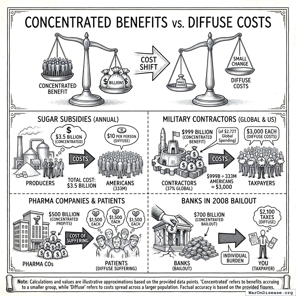 Pharma: $500 billion in profits (concentrated)147. Patients: $1,500 each (diffuse). Winner: pharma (obviously).