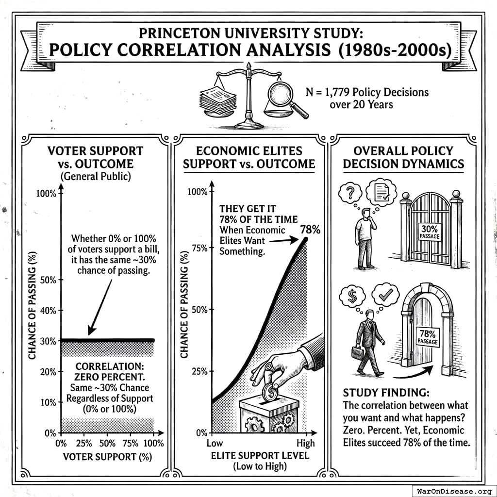 Princeton University analyzed 1,779 policy decisions over 20 years. The correlation between what ordinary voters want and what actually becomes law: zero percent146.