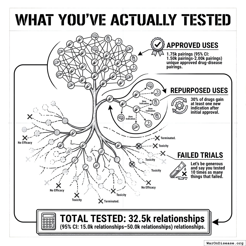 I want to sit with that for a moment. You have safe compounds. You have sick people. You have the ability to introduce them to each other. You have done this 0.342% (95% CI: 0%-1%) of the time. The other 99.66% of introductions have never been made. Not because they wouldn’t work. Because the molecule didn’t have a marketing budget.