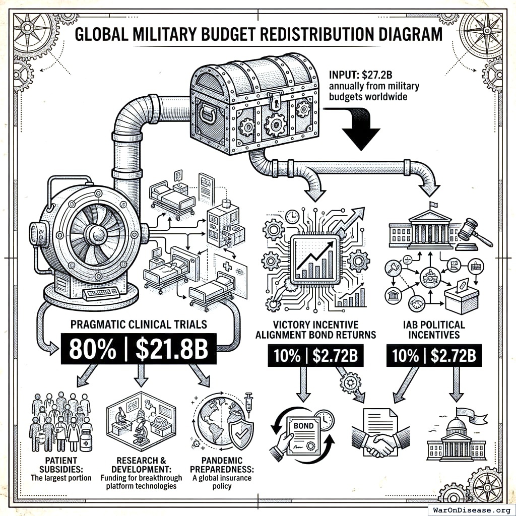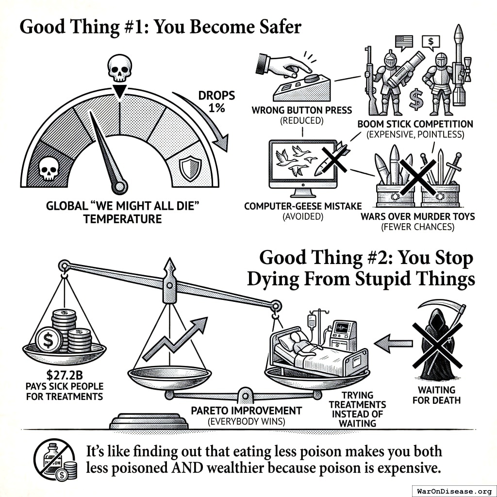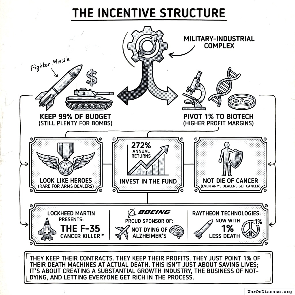 The military-industrial complex gets to keep 99% of their budget (still plenty for bombs), pivot 1% to biotech (the health market is growing; the bomb market just got 1% smaller), look like heroes (rare for arms dealers), invest in the fund (VICTORY Incentive Alignment Bonds161 pay 272% annually), and not die of cancer (even arms dealers get cancer). Especially the not dying of cancer part. The CEO of Lockheed Martin has the same cells you do. Those cells malfunction on the same schedule. No amount of missile production has ever cured a tumor.
