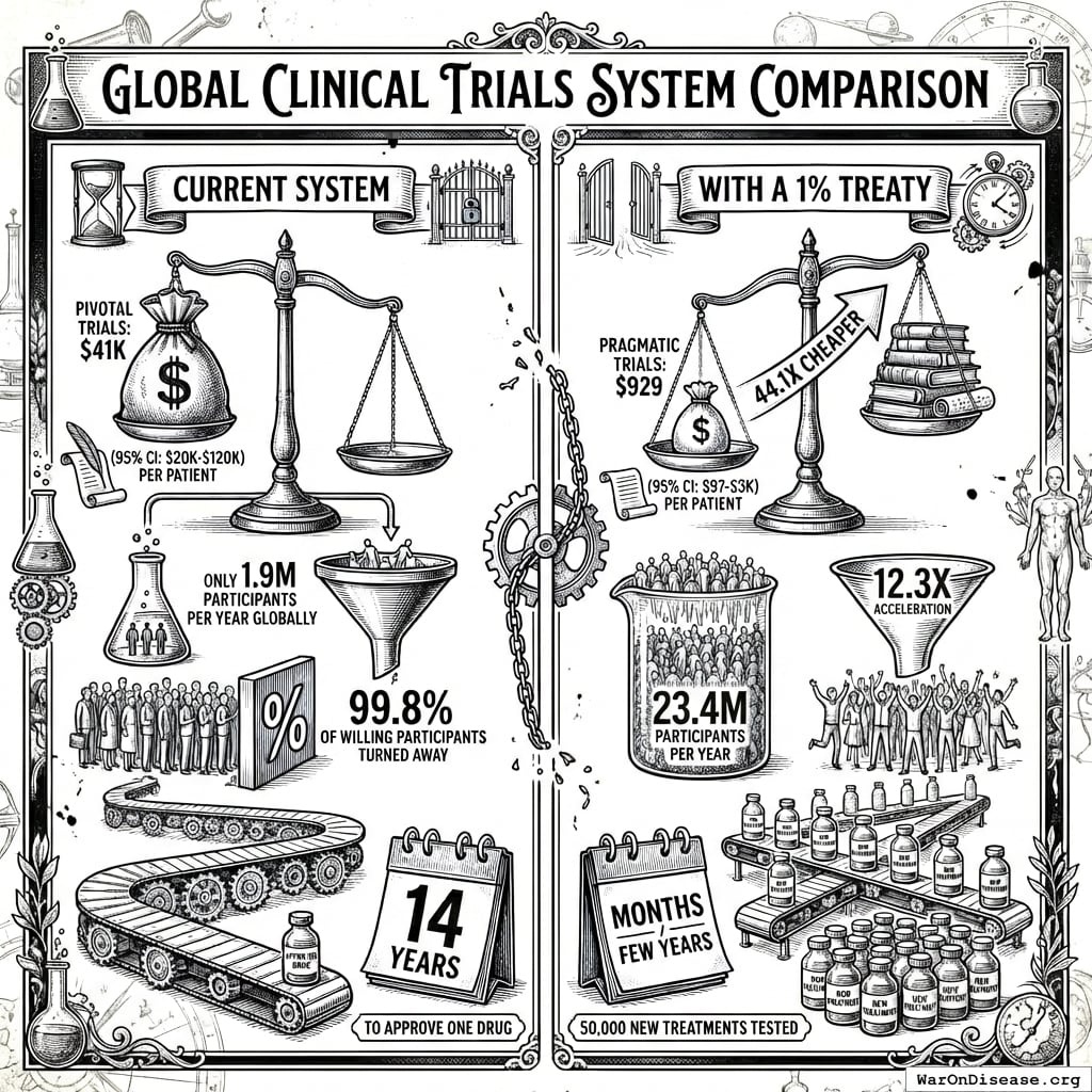 10.5281/zenodo.18243914 Only 15 diseases/year get their first treatment each year. With 6.65 thousand diseases lacking effective treatments, the backlog would take 443 years to clear. Integrating pragmatic trials into standard healthcare increases trial capacity 12.3x, cutting that timeline from 443 years to 36 years. The average untreated disease gets a treatment 212 years earlier, saving 10.7 billion deaths at $0.842 per year of healthy life saved.