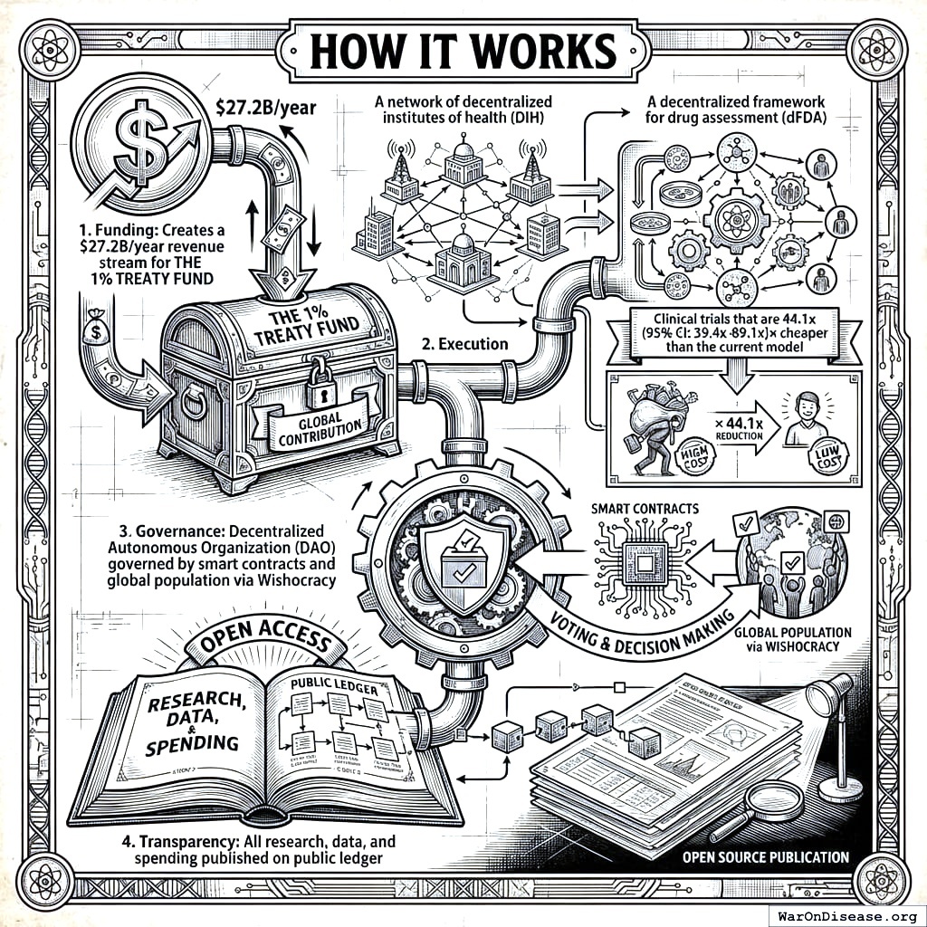 A 1% Treaty is a piece of paper that says every signatory nation redirects that 1% so any patient can join pragmatic clinical trials for the most promising treatments. That’s it. That’s the whole idea. On Wishonia, we fought for 12,000 years before we figured this out. Your species has been thinking it over for several thousand years, so you’re actually ahead of schedule (barely).
