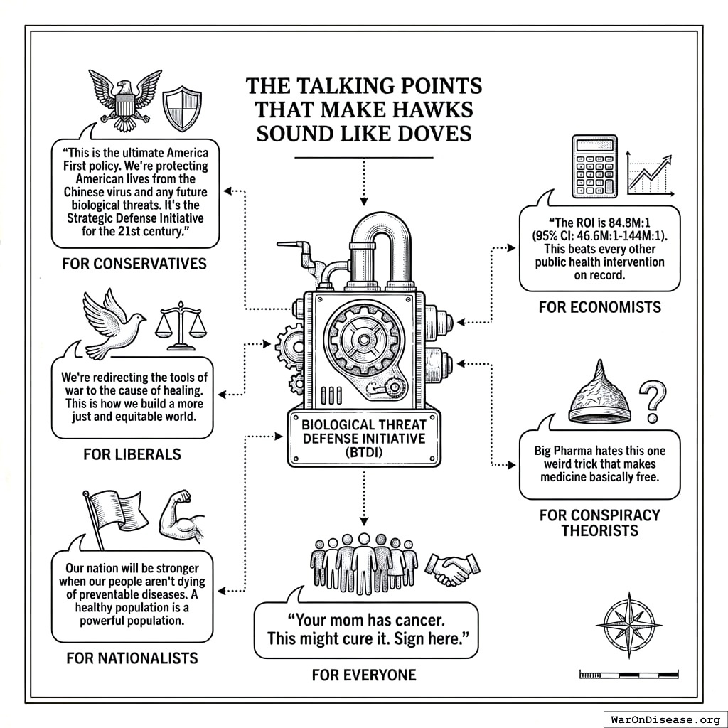 For Conservatives: “This protects American lives from diseases, which are basically immigrants that got past the immune system. It’s the Strategic Defense Initiative for the 21st century, except it works.”