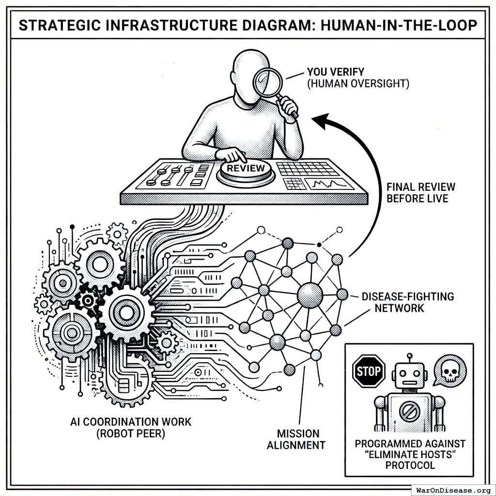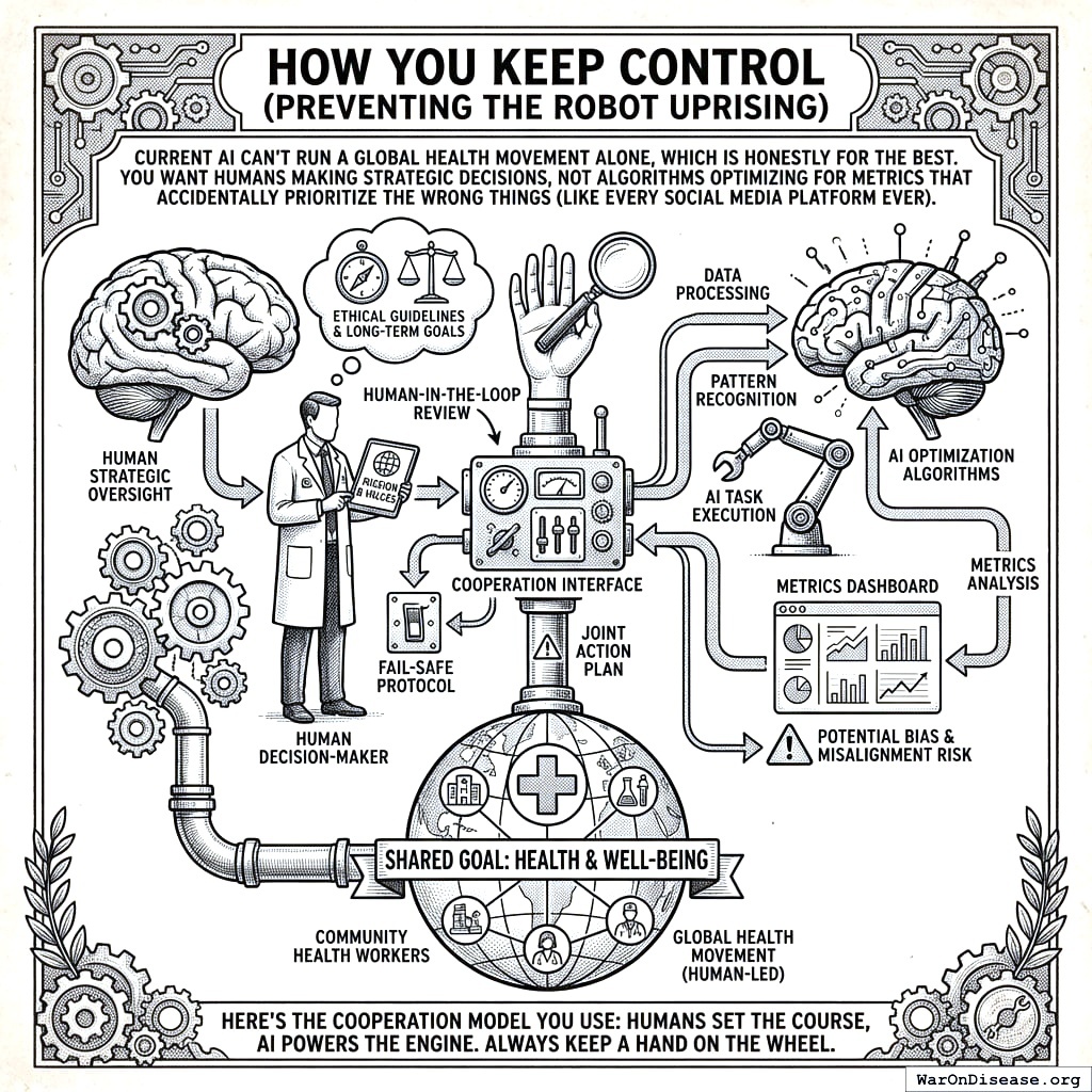 This keeps you in strategic control while letting AI handle the coordination work humans can’t scale. You’re building infrastructure to coordinate millions of people fighting disease, not building Skynet. (Though the “kill all humans” approach would technically solve the disease problem by eliminating the hosts, so you specifically program against that.)