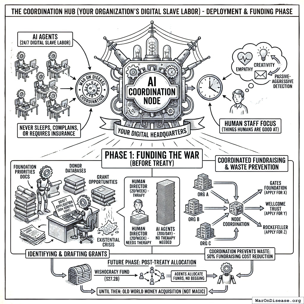 Once the treaty passes? Your agents shift from begging foundations to executing against the treaty-funded allocation system: patient-directed trial flows plus Wishocracy-governed shared priorities. But until then, we still live in the old world where money doesn’t magically appear.