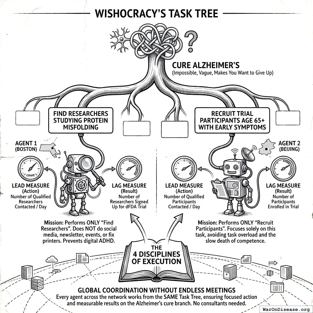 Wishocracy’s Task Tree breaks “Cure Alzheimer’s” (impossible, vague, makes you want to give up) down into executable tasks. Examples: “Find researchers studying protein misfolding” or “Recruit trial participants age 65+ with early symptoms.”