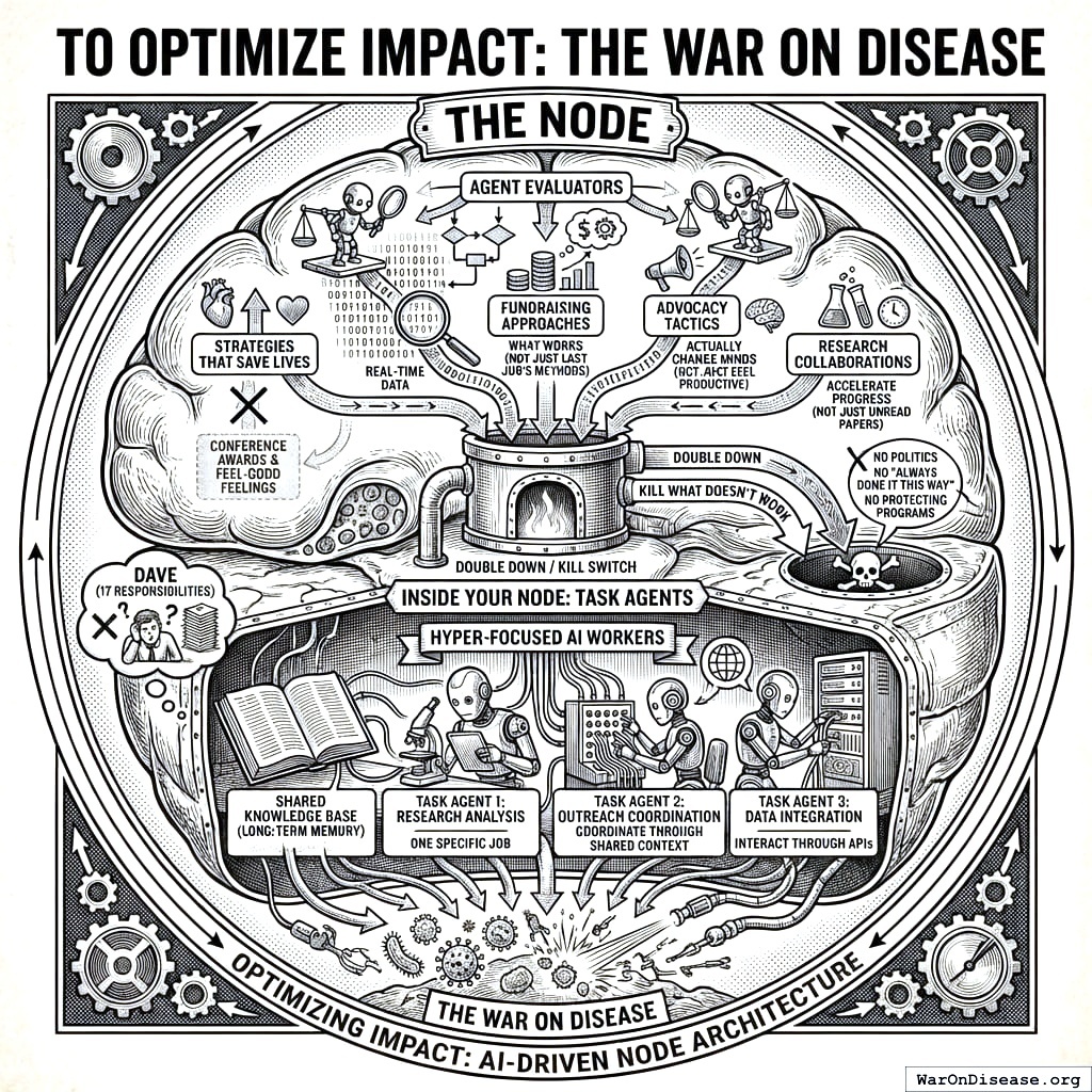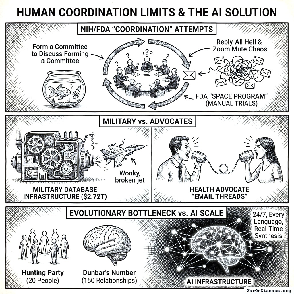 AI doesn’t have this limitation. It never sleeps. It speaks every language. It operates in every timezone simultaneously. It doesn’t get into passive-aggressive email wars. You win the War on Disease by building coordination infrastructure that works at the scale humans can’t. The NIH is still trying to schedule their next committee meeting.