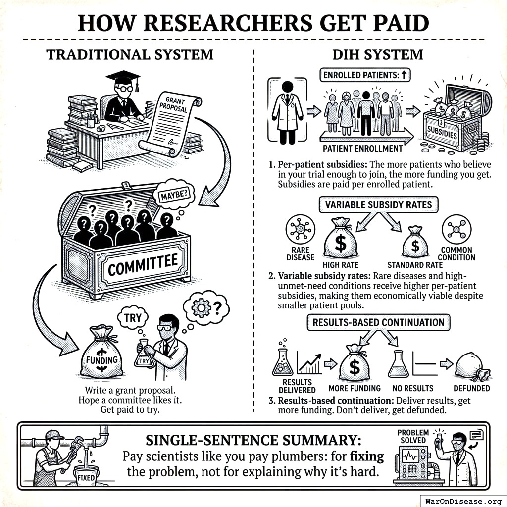 Every dollar flows based on results, not promises. Patients vote with their enrollment. Researchers get paid for attracting them. Things that work get more funding. Things that don’t get defunded. Nobody gets paid for writing grant proposals or publishing papers about why their research might work someday. This is how every other industry works. You pay contractors when they build the house, not when they promise to. You pay farmers when they grow the food, not when they apply for a farming license. Medicine went the other way (for reasons nobody can explain, and which I suspect don’t exist).