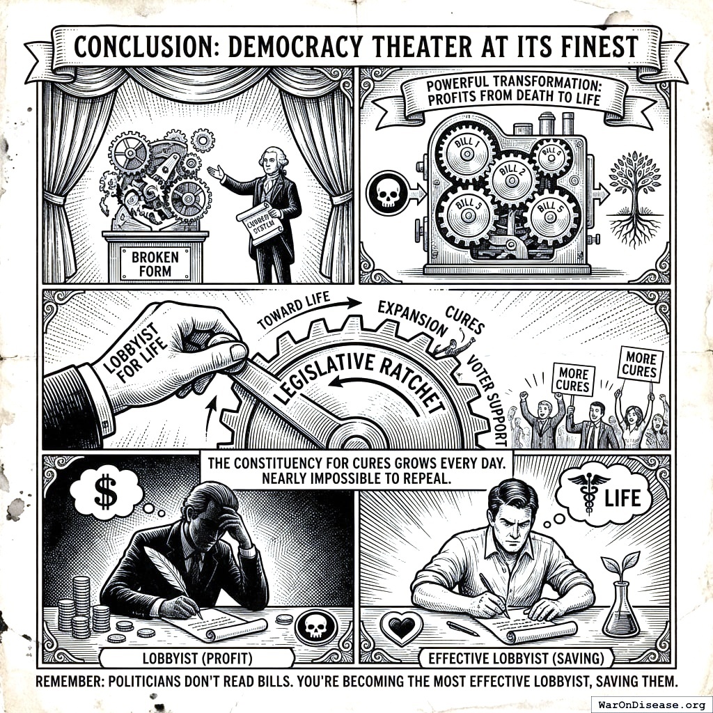 Here’s how democracy actually works: Lobbyists write bills and give them to politicians who can’t read. Those politicians vote based on who donated most to their campaign. You’re about to become the best lobbyist in history, except your bills actually help people instead of killing them.
