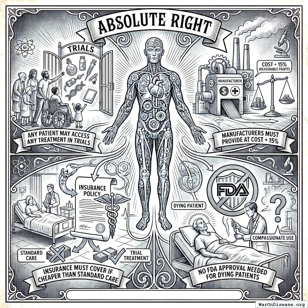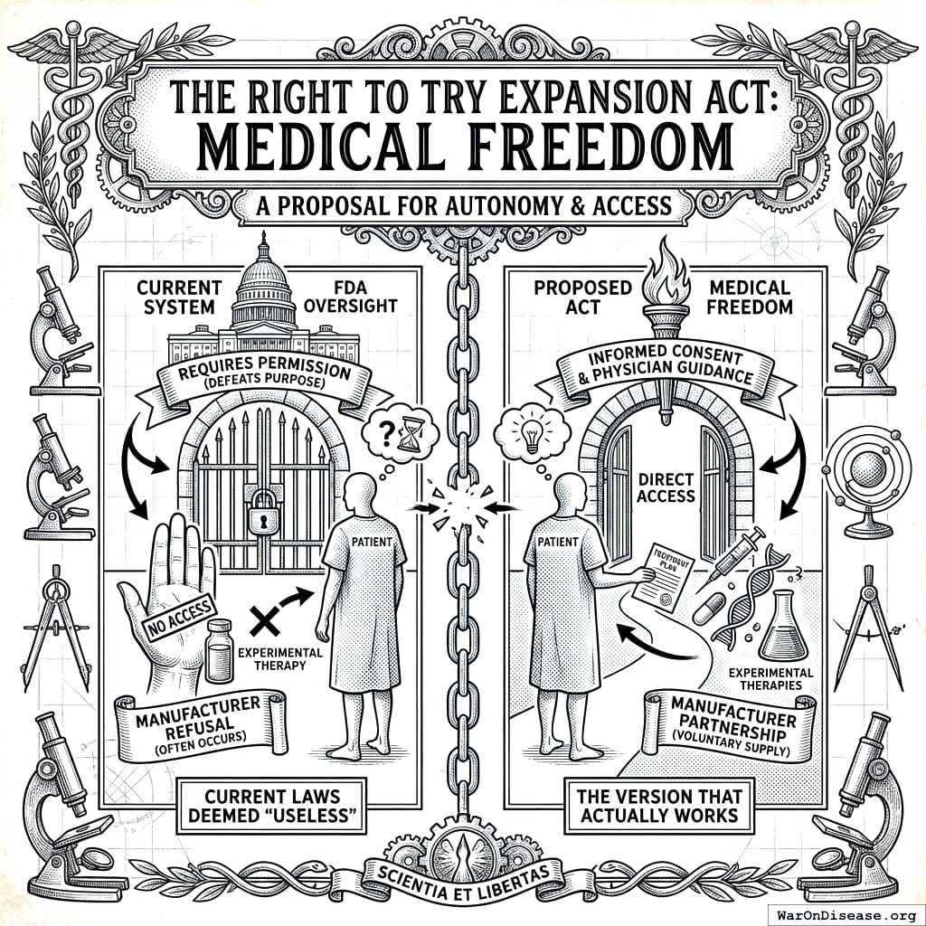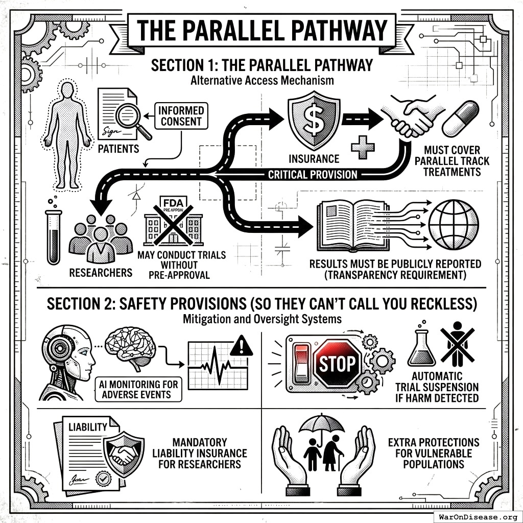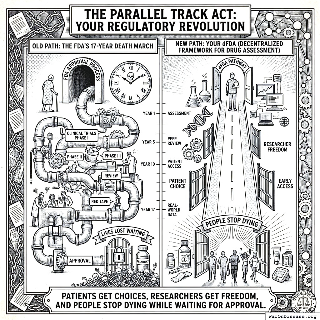 This act creates your decentralized FDA149,150. It builds a legal pathway for treatments to operate outside the FDA’s 17-year death march. Patients get choices. Researchers get freedom. People stop dying while waiting for approval.