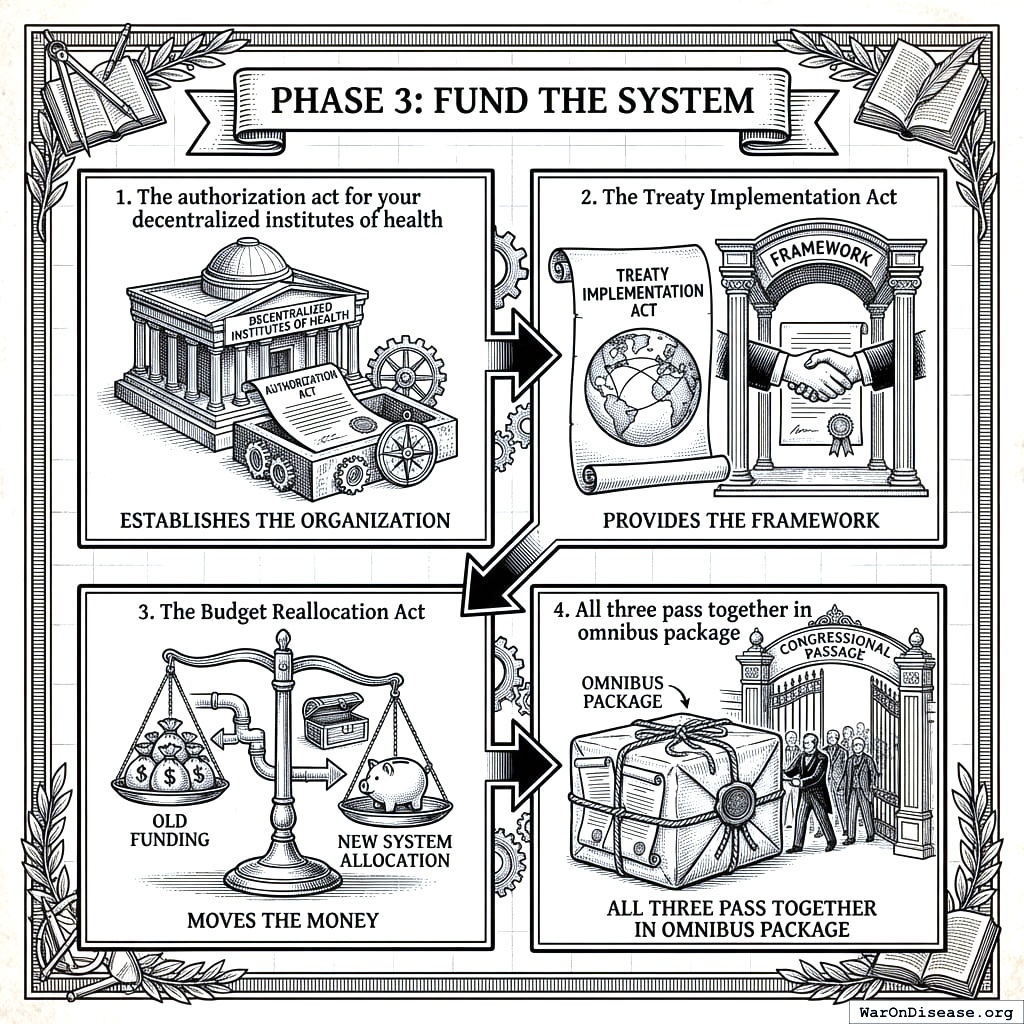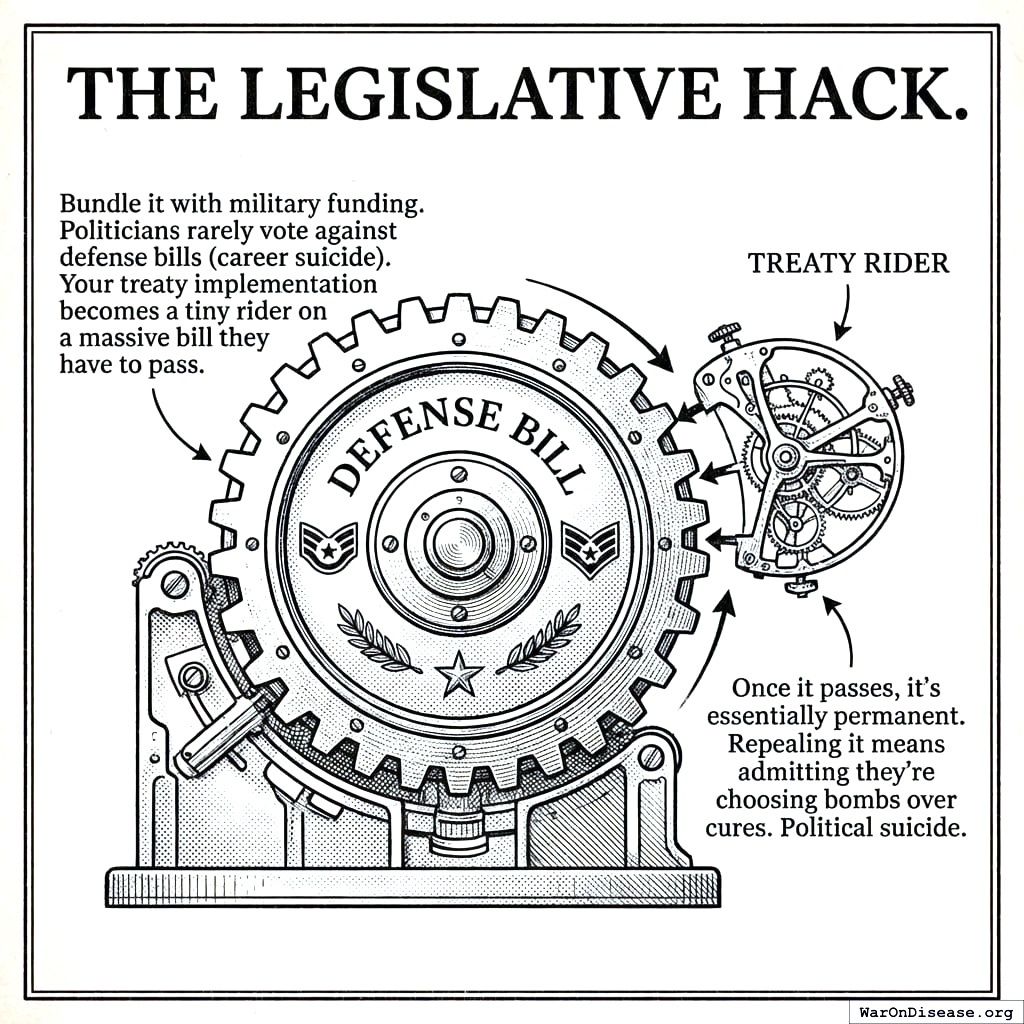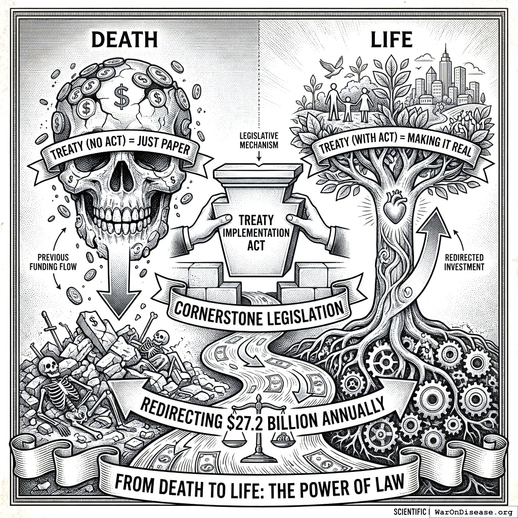 This is your cornerstone legislation. Without it, the treaty is just paper. With it, you redirect $27.2 billion annually from death to life.