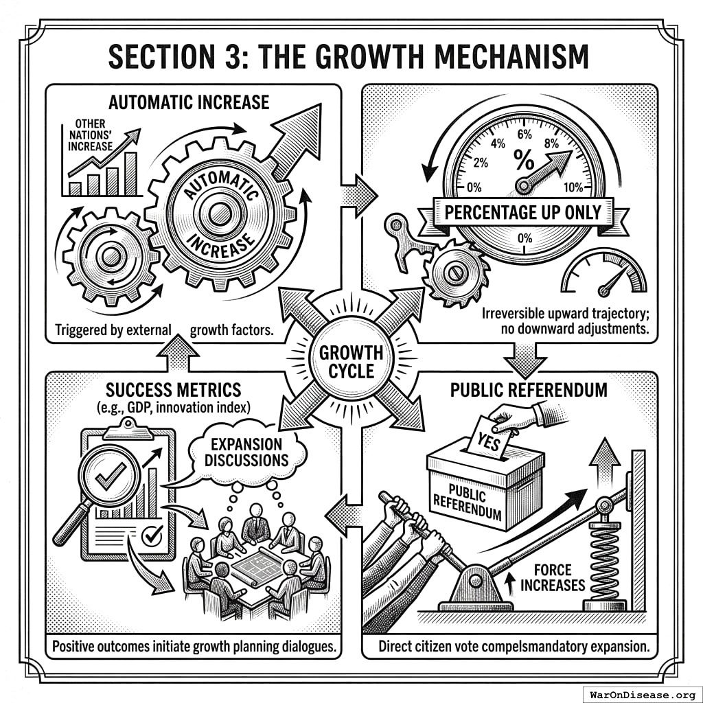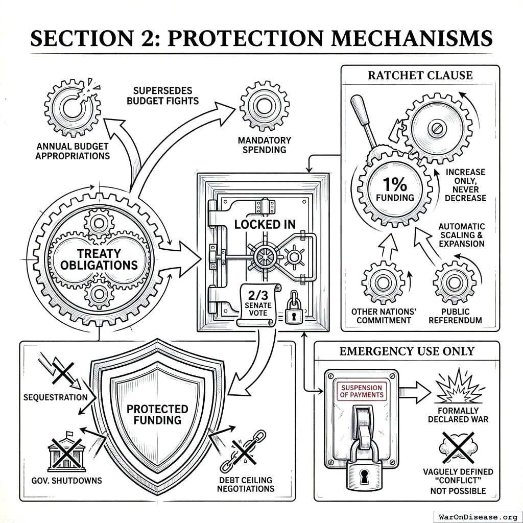 - Ratchet Clause: The 1% funding can only increase, never decrease. It automatically scales if other nations increase their commitment. Public referendum can expand it further.