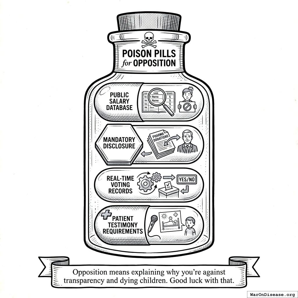 - Public salary database (shows who’s blocking cures)